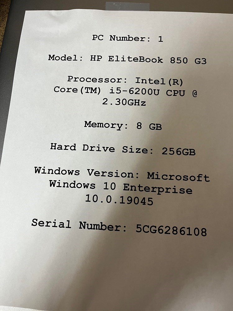 Model: HP EliteBook 850 G3 Processor: Intel(R) Core (TM) i5-6200U CPU @ 2.30GHz Memory: 8 GB Hard Drive Size: 256GB Windows Version: Microsoft Windows 10 Enterprise 10.0.19045 Serial Number: 5CG6286108