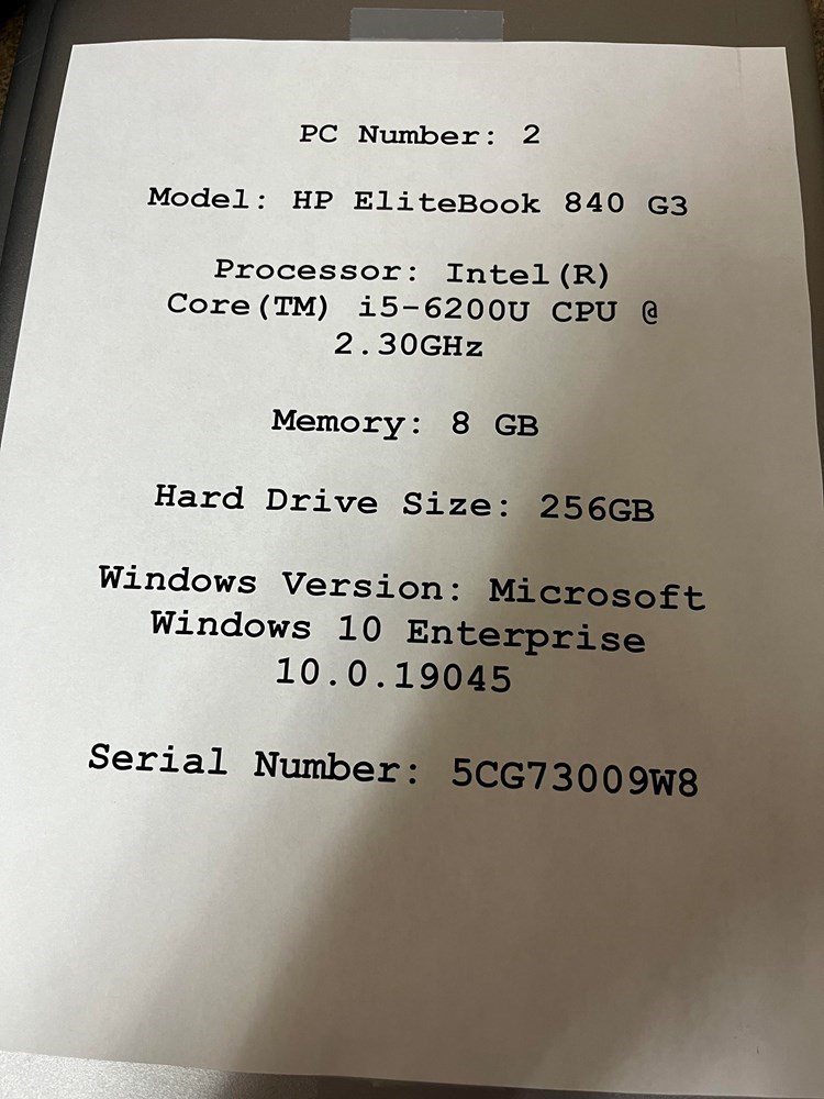 Model: HP EliteBook 840 G3 Processor: Intel(R) Core (TM) i5-6200U CPU @ 2.30GHz Memory: 8 GB Hard Drive Size: 256GB Windows Version: Microsoft Windows 10 Enterprise 10.0.19045 Serial Number: 5CG73009W8
