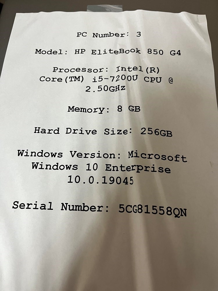 Model: HP EliteBook 850 G4 Processor: Intel(R) Core (TM) i5-7200U CPU @ 2.50GHz Memory: 8 GB Hard Drive Size: 256GB Windows Version: Microsoft Windows 10 Enterprise 10.0.19045 Serial Number: 5CG81558QN