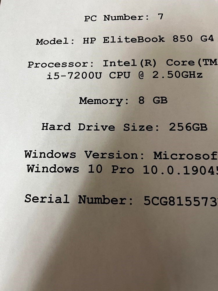 Model: HP EliteBook 850 G4 Processor: Intel(R) Core (TM) i5-7200U CPU @ 2.50GHz Memory: 8 GB Hard Drive Size: 256GB Windows Version: Microsoft Windows 10 Enterprise 10.0.19045 Serial Number: 5CG815573