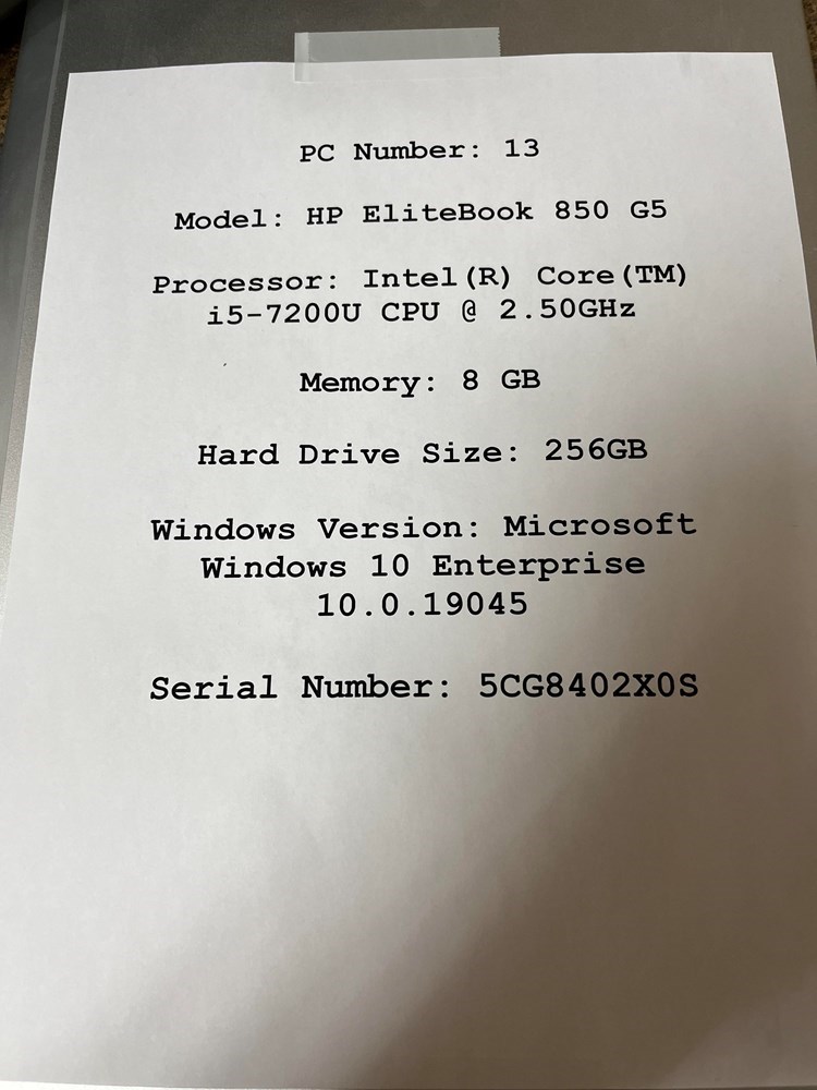 Model: HP EliteBook 850 G5 Processor: Intel (R) Core (TM) i5-7200U CPU @ 2.50GHz Memory: 8 GB Hard Drive Size: 256GB Windows Version: Microsoft Windows 10 Enterprise 10.0.19045 Serial Number: 5CG8402X0S