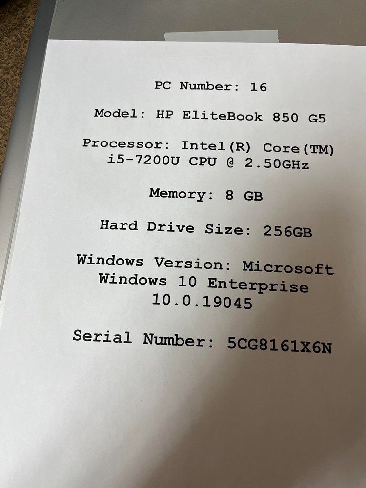 Model: HP EliteBook 850 G5 Processor: Intel (R) Core (TM) i5-7200U CPU @ 2.50GHz Memory: 8 GB Hard Drive Size: 256GB Windows Version: Microsoft Windows 10 Enterprise 10.0.19045 Serial Number: 5CG8161X6N