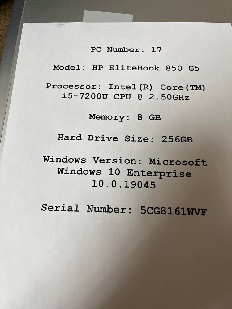 Model: HP EliteBook 850 G5 Processor: Intel (R) Core (TM) i5-7200U CPU @ 2.50GHz Memory: 8 GB Hard Drive Size: 256GB Windows Version: Microsoft Windows 10 Enterprise 10.0.19045 Serial Number: 5CG8161WVF