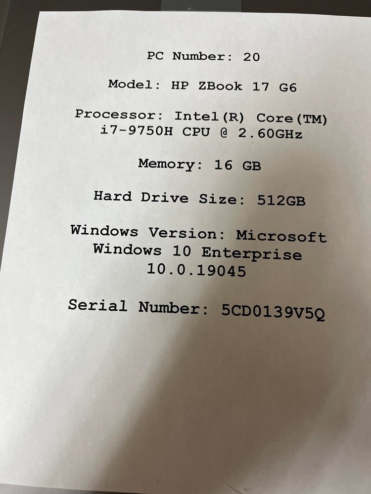 Model: HP ZBook 17 G6 Processor: Intel (R) Core (TM) i7-9750H CPU @ 2.60GHz Memory: 16 GB Hard Drive Size: 512GB Windows Version: Microsoft Windows 10 Enterprise 10.0.19045 Serial Number: 5CD0139V5Q