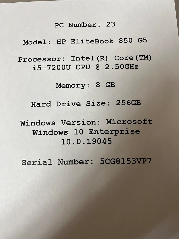 Model: HP EliteBook 850 G5 Processor: Intel (R) Core (TM) i5-7200U CPU @ 2.50GHz Memory: 8 GB Hard Drive Size: 256GB Windows Version: Microsoft Windows 10 Enterprise 10.0.19045 Serial Number: 5CG8153VP7